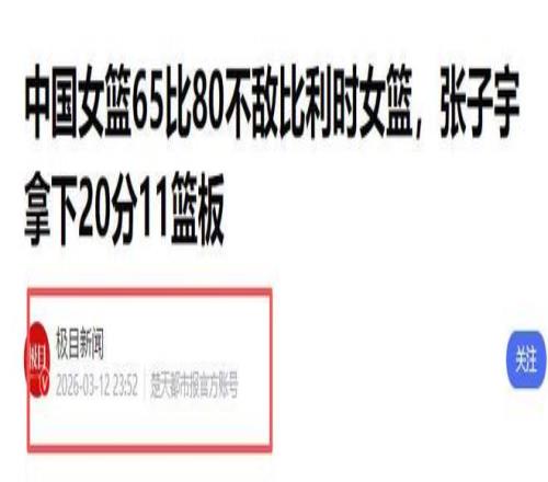極目新聞2026-03-12《中國女籃65比80不敵比利時女籃,張子宇拿下20分11籃板》