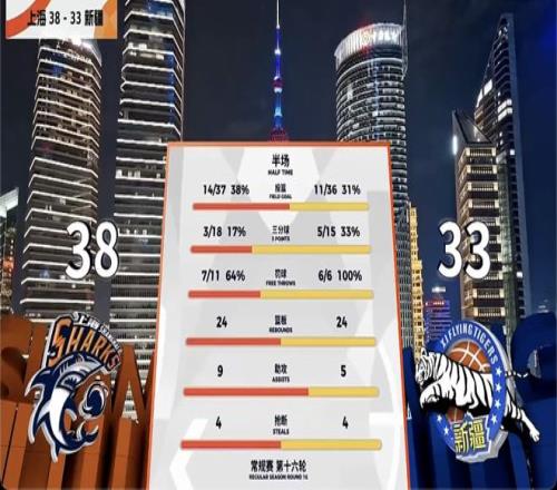 隨后大鯊魚外援古德溫開始發(fā)力,大號(hào)三分命中吹響球隊(duì)反攻的號(hào)角,古德溫這一節(jié)4投全中,獨(dú)砍11分。在他的帶領(lǐng)下,上海男籃打出一個(gè)11比0,反超比分。而新疆男籃第二節(jié)19次出手僅僅投進(jìn)5球。大鯊魚單節(jié)打出25比16,在半場(chǎng)結(jié)束時(shí)以38比33領(lǐng)先5分。