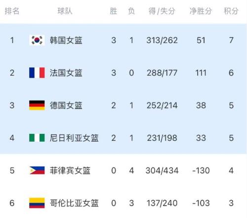 隨著韓國隊31分大勝,中國女籃10分小勝,世預(yù)賽最新積分形勢也已經(jīng)出爐。
