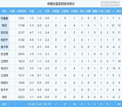 球員數(shù)據(jù)統(tǒng)計(jì),王思雨14分1板3助、韓旭12分4板1助、楊舒予11分2板6助、羅欣棫11分2板、李月汝9分4板1助、陳玉婕9分3板3助、陳明伶4分6板2助、張子宇4分2板、王佳琦3分4板3助2斷、張曼曼3分1板2助、唐子婷2分5板、張茹2分