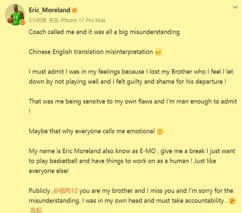 然而沒有料到的是,看上去大大咧咧的莫蘭德,在看了楊鳴對他的評價后,當(dāng)天晚上躺在床上翻來覆去卻怎么也睡不著。于是,他就在凌晨一點多發(fā)了一條動態(tài)回應(yīng)這件事。主要想表達的是,對于楊鳴在第一階段執(zhí)教遼籃期間,他對于自己的表現(xiàn)時好時壞而感到愧疚。因為他覺得自己CBA生涯的最大恩人楊鳴的突然辭職,跟他不夠穩(wěn)定的比賽狀態(tài)不無關(guān)系。