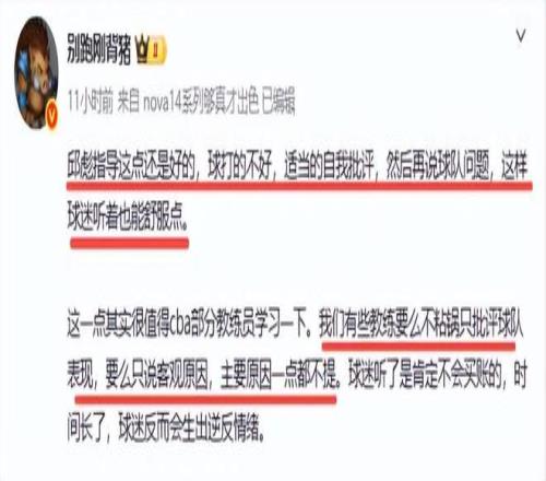 值得注意的是,山東隊輸球后,邱彪賽后已是多次攬責和向球迷道歉。昨晚仍然是如此,先攬責后再批評隊員,批評也就讓人接受了。邱彪的做法也獲得媒體人的點贊。別跑剛背豬就在社媒表揚了邱彪,同時暗批了一些教練,就差點說出名字了。