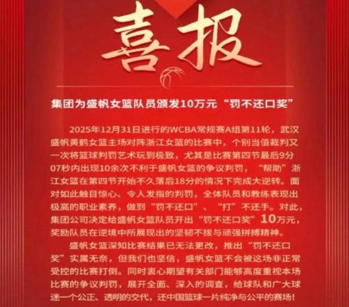 2025年12月31日WCBA第11輪,武漢盛帆女籃遭遇爭議判罰,導致輸給浙江女籃。賽后,武漢盛帆女籃因球員和教練在爭議判罰中保持"罰不還口""打不還手"的職業素養,特獎勵全隊10萬元。此舉旨在肯定球員精神,同時表達對裁判工作的強烈不滿。