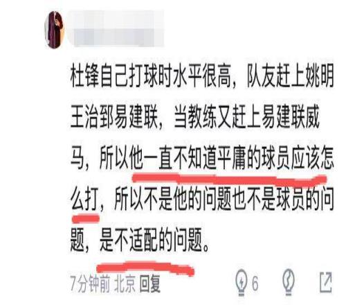 此外,還有部分球迷闡述了客觀事實:“杜鋒自己打球時水平很高,隊友趕上姚明王治郅易建聯,當教練又趕上易建聯威馬,所以他一直不知道平庸的球員應該怎么打,所以不是他的問題也不是球員的問題,是不適配的問題?!?/p>
