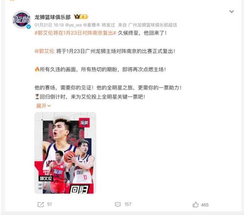 第二個消息分享一下郭艾倫復出時間敲定的情況。大家都知道在前段時間對陣廣東隊的比賽結束之后,郭艾倫因為傷病的問題長時間缺席廣州隊的比賽,到如今已經休息了差不多十場以上的比賽。而如今根據廣州隊官宣的最新消息,郭艾倫已經確定在1月23號對陣南京隊的比賽中將會復出,到時候他也會帶領廣州隊爭取拿下這場比賽的勝利。
