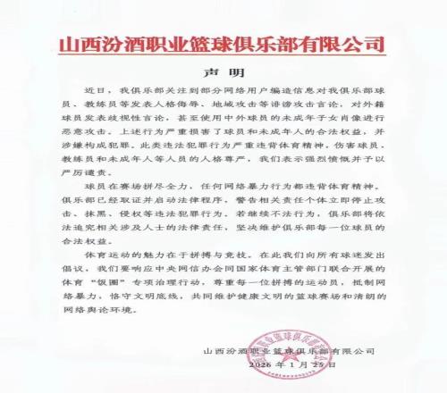 1月25日晚間,山西汾酒職業籃球俱樂部發布聲明稱,球隊球員、教練和球員的未成年子女遭到部分網絡用戶的惡意攻...