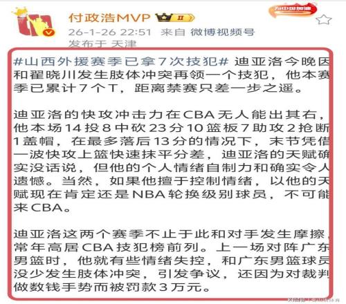 迪亞洛累計7次技術犯規,著名媒體人付政浩發文表示:迪亞洛本賽季已累計7個T,距離禁賽只差一步之遙……迪亞洛的天賦確實沒話說,但他的個人情緒自制力和確實令人遺憾。當然,如果他擅于控制情緒,以他的天賦現在肯定還是NBA輪換級別球員,不可能來CBA。迪亞洛這兩個賽季不止于此和對手發生摩擦,常年高居CBA技犯榜前列。上一場對陣男籃時,他就有些情緒失控,和廣東男籃球員沒少發生肢體沖突,引發爭議,還因為對裁判做數錢手勢而被罰款3萬元……