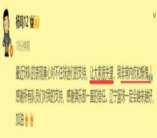 在遼籃宣布楊鳴因身體原因離隊休息后不久,楊鳴也通過個人社交媒體對自己的辭職進行了回應。他并沒有找借口,而是一如既往地那么有擔當,開口就向球迷道歉,表示內疚和慚愧。