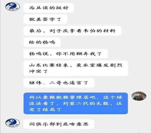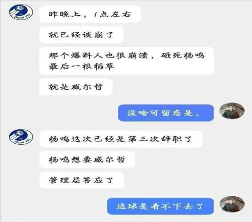 事后球迷評論區,有球迷曬出了一張和“知情人”聊天的截圖,據“知情人”透露,這不是楊鳴第一次選擇辭職,而是第三次,“砸死”楊鳴的最后一根稻草,就是威爾哲,之前楊鳴想要管理層引進威爾哲,管理層答應了,并且雙方就差簽字了,但到了最后,總經理劉子慶卻出爾反爾,拿著韋伯的材料給楊鳴,楊鳴表示:你不用糊弄我了。