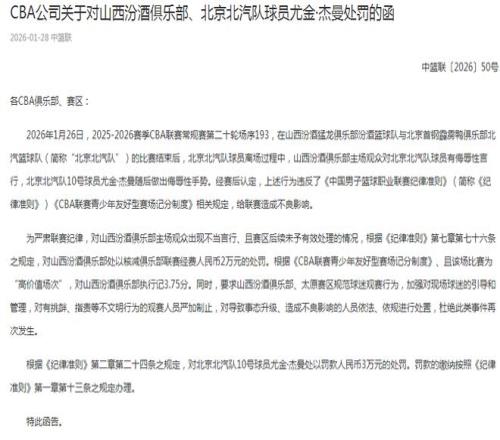 2026年1月26日,2025-2026賽季CBA常規賽第二十輪,在山西與北京的比賽結束后,北京球員離場過程中,山西主場觀眾對北京球員有侮辱性言行,北京外援杰曼隨后做出侮辱性手勢。經賽后認定,上述行為違反《中國男子籃球職業聯賽紀律準則》、《CBA聯賽青少年友好型賽場記分制度》相關規定,給聯賽造成不良影響。
