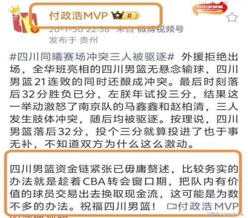 四川隊目前的窘境,也讓許多業(yè)內(nèi)人士憂心忡忡,著名體育記者付政浩,在個人社交媒體上發(fā)文,對四川隊目前的舉步維艱的狀態(tài),提出了一個“解套”辦法,他認(rèn)為“四川男籃資金鏈緊張已毋庸贅述,比較務(wù)實的辦法就是趁著CBA轉(zhuǎn)會窗口期,把隊內(nèi)有價值的球員交易出去換取現(xiàn)金流,這可能是為數(shù)不多的辦法。祝福四川男籃。”。