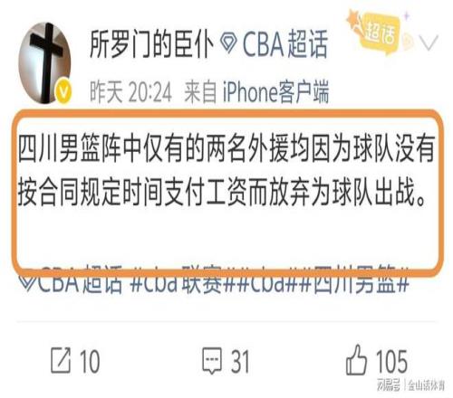 本場比賽賽前,據(jù)媒體人“所羅門的臣仆”就在社媒發(fā)文爆料:四川男籃陣中僅有的兩名外援均因為球隊沒有按合同規(guī)定時間支付工資而放棄為球隊出戰(zhàn)。,隨后,“所羅門的臣仆”又補充表示“兩個外援目前還沒見過工資。”。