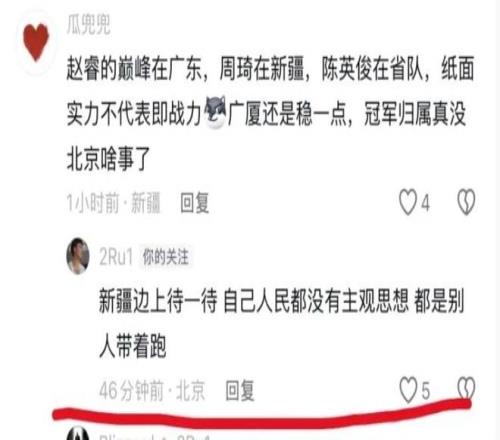 其實趙睿的意思不難理解,他主要是想說新疆球迷容易被帶節奏,但在說法上卻非常不妥,他用了“人民”兩個字,這已經超出了籃球的范疇了,懂的都懂,這里就不多說了。目前有關趙睿的這次留言正在持續發酵,很多球迷都認為趙睿的這次發言非常不當。特別是新疆球迷,對趙睿僅存的那點兒好感也沒有了,不少新疆球迷都打電話向相關球迷投訴。對于自己的這次發言,趙睿好像并沒有認識到不當之處,反而進一步進行了回復,表示自己不該就這么被人說。
