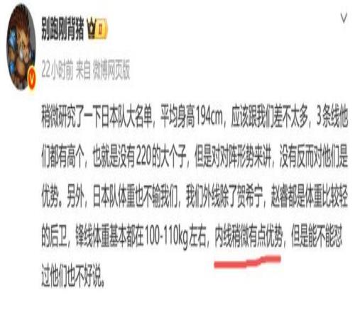 日前,日本籃協公布了世預賽的集訓名單,對此媒體人別跑剛背豬發文表示:“日本平均身高1米94,和中國男籃差不太多,但中國男籃有內線優勢。”
