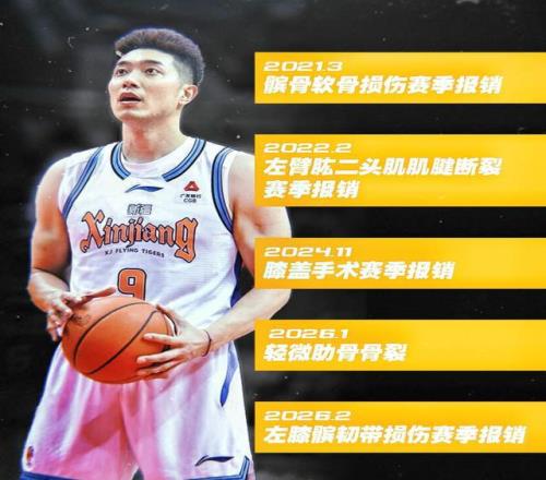 2月3日,新疆對陣浙江的比賽中,第三節還剩6分49秒,吳冠希在一次無對抗落地時左膝突然失穩,痛苦倒地。經醫院檢查與多專家會診,確診為左膝髕韌帶損傷——這一傷勢通常需要3至6個月康復,意味著他將徹底告別2025-26賽季。