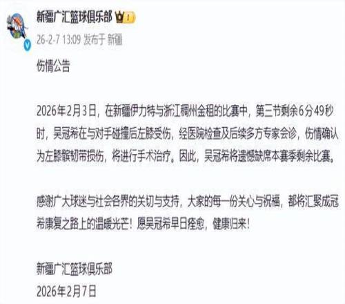 新疆男籃在公告中寫道:“大家的每一份關心與祝福,都將匯聚成冠希康復之路上的溫暖光芒!愿吳冠希早日痊愈,健康歸來!”