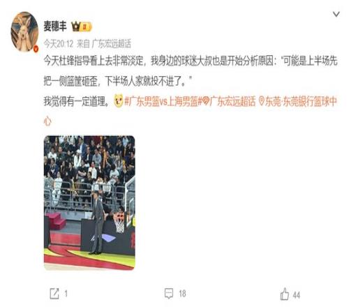 廣東媒體人麥穗豐都已經輸到調侃主隊了:杜鋒看上去非常淡定,我身邊的大叔開始分析原因‘上半場先把籃筐砸歪,下半場上海就投不進了’,我覺得有一定的道理。