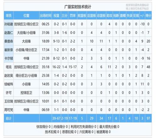 本場比賽,廣廈隊奪了97分,三個外援拿到了84分,其他球員一共拿了13分,其中,一個人拿了7分,其他三個人各拿了2分。