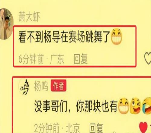 但是,對于故意挑事的,楊鳴也絕對不會慣著。比如說有網友很明顯是帶著冷嘲熱諷的腔調給他留言說:“再也看不到楊導在賽場跳舞了”,楊鳴也是毫不客氣地予以了回應,他說“沒事哥們,你那塊也有?!痹趺礃??給力不?