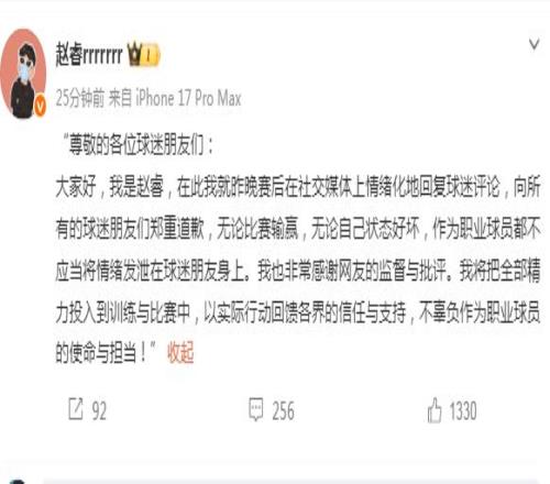 大家好,我是趙睿。在此我就昨晚賽后在社交媒體上,情緒化地回復球迷評論,向所有球迷朋友們鄭重道歉。
