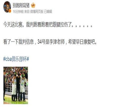 根據媒體人別跑剛背豬報道:“今天這比賽。裁判跑著跑著把跟腱拉傷了……看了一下裁判信息,34號是李津老師,希望早日康復吧!”