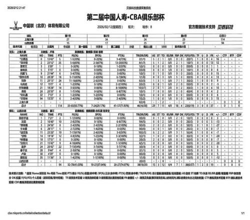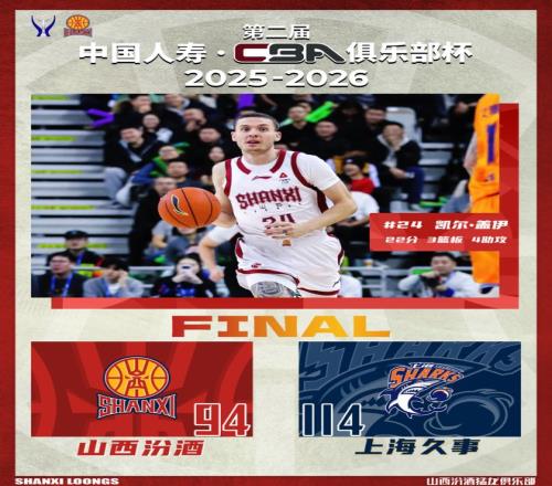 北京時間2026年2月12日19:30,第二屆中國人壽·CBA俱樂部杯決賽打響,山西汾酒在內蒙古體育館,挑戰衛冕冠軍上海久事。本場比賽,山西隊進攻狀態欠佳,防守不夠積極主動,包括籃板球處于劣勢,導致大比分落后,下半場全隊有明顯改善,并在末節奮力追分,但終究不敵對手,最終全場比賽結束,山西汾酒94:114不敵上海久事,獲得第二屆CBA俱樂部杯亞軍。