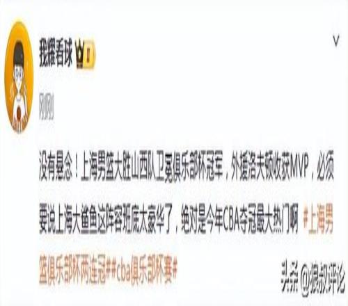 沒有懸念!上海男籃大勝山西隊衛冕俱樂部杯冠軍,外援洛夫頓收獲MVP,必須要說上海大鯊魚這陣容班底太豪華了,絕對是今年CBA奪冠最大熱門。