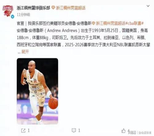 值得一提的是,在與約克解約后,浙江稠州金租男籃同時宣布,俱樂部已正式簽約美籍后衛安德魯·安德魯斯,這位32歲老將,將代表浙江男籃出戰2025-2026賽季剩余比賽。作為一名雙能衛,安德魯斯在效力澳大利亞NBL期間,場均貢獻14.5分、2.4個籃板和5.8次助攻,其助攻數高居聯盟第五位。從打法和個人特點來看,安德魯斯既具備良好的人球結合突破能力,也有很強的得分能力,同時擁又具備組織串聯能力。屬于能突能投能傳的全能型小外援。