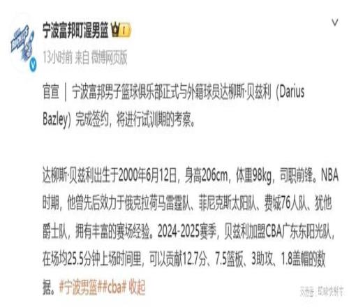 另外,值得一提的是,2000年出生的貝茲利,今年也才只有26歲,正值職業生涯上升期。雖然此前他曾遭遇傷病侵蝕,不過,總體恢復情況還算不錯。在對抗不算太激烈的CBA聯賽,貝茲利應該沒啥問題。而在貝茲利加盟以后,寧波隊將如虎添翼,在三號位又增強了籌碼??礃幼樱瑢幉牨举惣敬_實要沖擊季后賽,甚至是成為CBA本賽季第一黑馬。