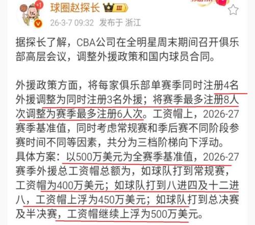 此外,在外援的工資方面,也是進行調整,本賽季,外援的總工資帽為500萬美元,下賽季,將會調整到400萬美元。當然了,還會設置一些浮動,季后賽進入八強的球隊,外援總工資帽調整到450萬美元;闖進CBA總決賽的球隊,外援總工資帽調整到500萬美元。