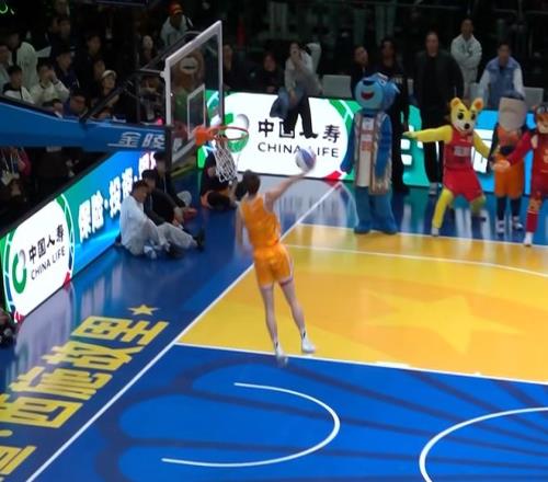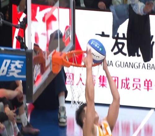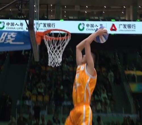 張文杰選擇籃下沖出來,大風(fēng)車轉(zhuǎn)體暴扣,第一次失敗,第二次成功,獲得46分。