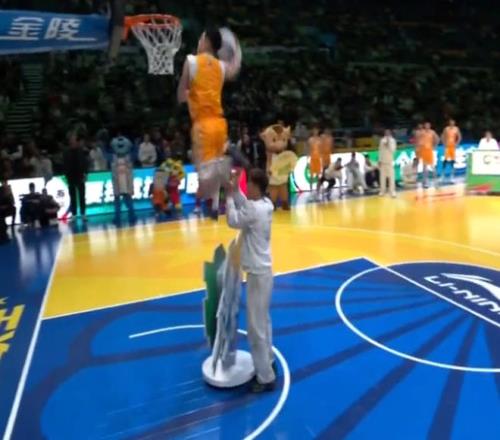 張鼎巖出場(chǎng),工作人員頭頂拿球,張鼎巖飛躍并奪球完成風(fēng)車扣籃,獲得50分。