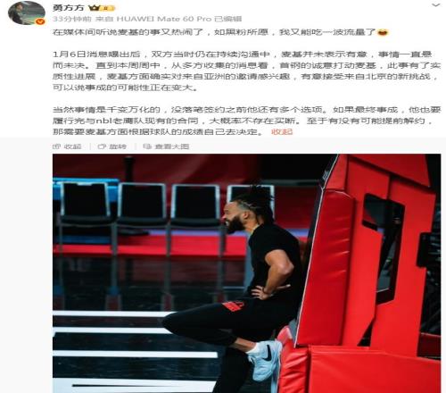 勇方方寫道:“1月6日消息曝出后,雙方當時仍在持續溝通中,麥基并未表示有意,事情一直懸而未決。直到本周周中,從多方收集的消息看,首鋼的誠意打動麥基,此事有了實質性進展,麥基方面確實對來自亞洲的邀請感興趣,有意接受來自北京的新挑戰,可以說事成的可能性正在變大?!?/p>