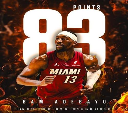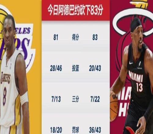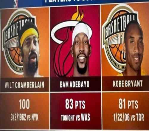 當(dāng)本場(chǎng)比賽終場(chǎng)哨聲響起,比分定格在150比129,熱火豪取六連勝,而阿德巴約的名字(83分),正式超越科比(81分),獨(dú)占NBA歷史單場(chǎng)得分榜第二位,僅次于上古大神張伯倫的100分神跡 。