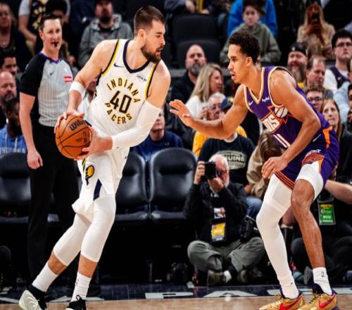 太陽過去3場連贏鵜鶘、黃蜂與雄鹿收獲3連勝,步行者過去10場遭遇10連敗,本賽季首次交鋒太陽主場133-98大勝步行者。本場太陽缺少阿倫、狄龍、馬威,步行者缺少哈利伯頓、托平、西亞卡姆與內(nèi)史密斯。首節(jié)開局太陽5-9落后,太陽連得4分追平,太陽隨后取得14-11領(lǐng)先。步行者一波9-1攻勢反超5分,太陽連得5分追平,雙方繼續(xù)持續(xù)交替領(lǐng)先纏斗,布克與內(nèi)姆哈德展開對攻,首節(jié)結(jié)束雙方維持36-36。首節(jié)太陽三分7中4,布克10中6得到15分;步行者三分12中5,內(nèi)姆哈德5中4得到11分。