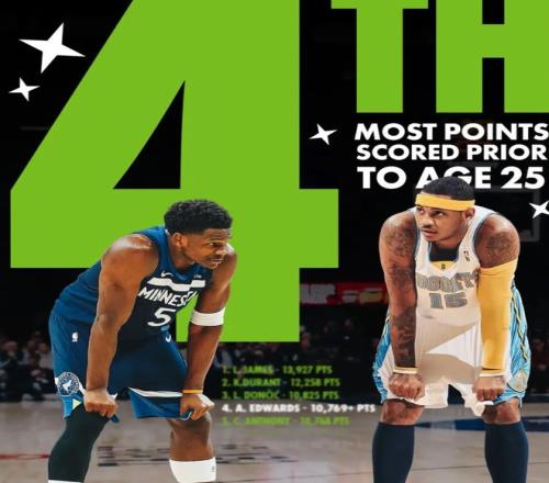 據(jù)統(tǒng)計(jì),愛德華茲的NBA生涯總得分已經(jīng)超過了10768分,正式超越“甜瓜”安東尼,躍升到了“NBA25歲前球員得分榜”的第4名。排在愛德華茲前面的,是詹姆斯的13927分、杜蘭特的12258分和東契奇的10825分。