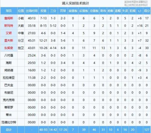 整個上半場湖人攻防一體全面壓制掘金,但是第三節崩盤被掘金抹平比分,第四節關鍵時刻里弗斯故意第二罰不中絕平比分,加時賽東契奇命中準絕殺。但是從數據角度來看,東契奇、里弗斯都不是贏球頭號功臣,頭號功臣必然是斯瑪特,全場比賽15中8得到21分2籃板2助攻5搶斷正負值+16斷檔全場第一,穩定的外線投射以及出色的防守,是湖人最終贏球的最大功臣。這場比賽湖人已經發揮到了極致,一度領先17分且對方穆雷發揮失常,本不應該贏得如此艱難!