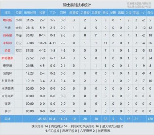 目前騎士41勝27負仍居東部第四,領先第五的魔術2個勝場。最后看看數據,說說你的心情: