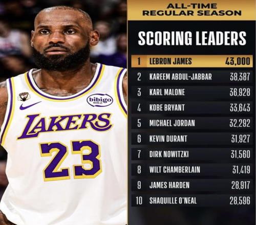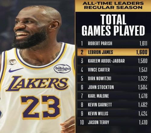 杜蘭特繼續往上追,最后繞不開的人還是詹姆斯。2月23日,NBA官網把詹姆斯的最新位置擺到了臺面上:他在自己的第1600場常規賽里跨過43000分,繼續排在歷史得分榜第一;與此同時,他的常規賽總出場數也來到1600場,升到歷史第二,只落后帕里什的1611場。這樣一來,杜蘭特要追更高的得分排名,抬頭看到的是詹姆斯;而詹姆斯現在不只壓著歷史得分榜,常規賽總出場次數榜也已經逼到第一門口。