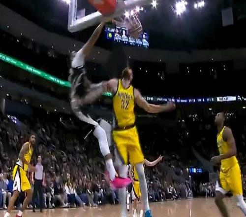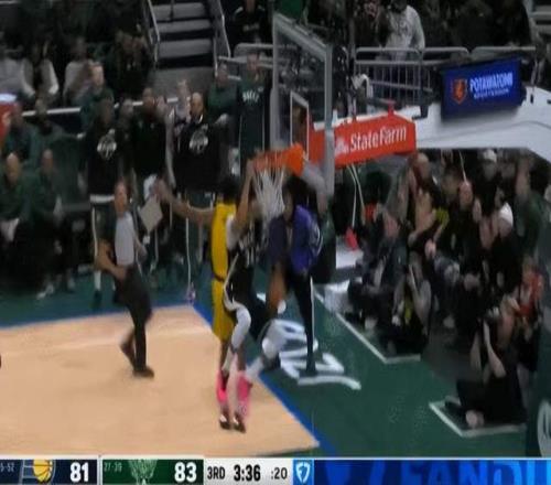 而最離譜的是,出現這種情況之后,字母哥并沒有直接退場,在步行者快攻回合結束后,還留在前場的字母哥接隊友傳球,加速沖向籃筐又是一記暴力扣籃。