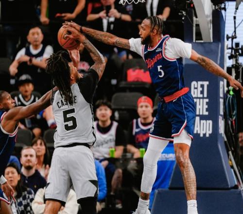 本場比賽倫納德缺席,科林斯進入首發(fā),上來小瓊斯三分命中,大洛佩斯三分也進,卡斯爾罰球破荒,可快船進攻勢頭依然火熱,鄧恩三分也把握住,取得13-1領先。馬刺依然沒有喊停,尚帕尼籃下打進止血,加蘭反擊上籃打進,快船取得17-3打停馬刺。瓦塞爾突破扣籃展開反撲,馬刺提升了防守強度,開始不斷拿分,成功將分差迫近,加蘭命中三分穩(wěn)住,快船還是能占據(jù)一些主動,可未能頂住馬刺反撲,首節(jié)打完37-29領先。