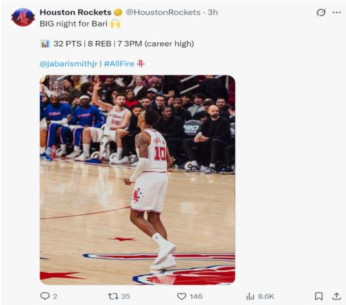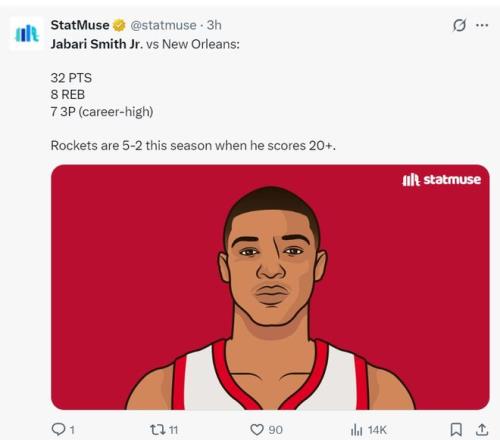 這場比賽小賈32分是賽季新高,他延續(xù)了生涯的一場紀錄,那就是進入聯(lián)盟后他每一個賽季都至少拿到一場30+,除此之外7個三分球也是小賈生涯新高,小賈本賽季拿下20+時火箭拿下5勝2負。