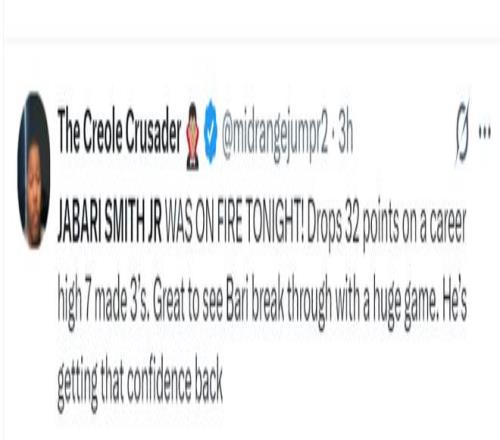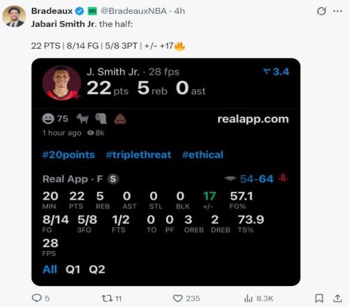 全場比賽小賈巴里-史密斯41分鐘,21中11,三分13中7,罰球4中3,拿到32分8籃板1蓋帽,命中率52.4%,三分命中率53.8%,正負值+21。