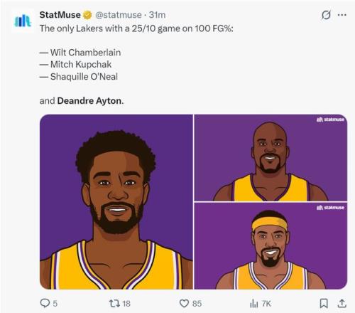 4.艾頓是湖人隊史第三位以100%命中率拿到25+10的球員,比肩張伯倫、奧尼爾;