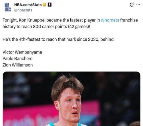 憑借這樣的表現(xiàn),克努佩爾僅花費(fèi)42場(chǎng)比賽就拿到800分,創(chuàng)造黃蜂隊(duì)史最快紀(jì)錄,也是NBA2020年以來第四快,僅次于文班亞馬、班凱羅與錫安三人。