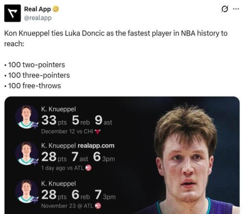 同時(shí)克努佩爾僅花費(fèi)42場(chǎng)比賽就達(dá)成100記三分+100記兩分+100記罰球里程碑,追平東契奇并列NBA歷史最快。