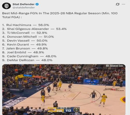 亞歷山大連續129場砍下20+,繼續刷新自己創造的NBA歷史紀錄。以雷霆的戰績還有亞歷山大的數據,他要蟬聯常規賽MVP了。再看一組數據,本賽季中距離跳投命中率,亞歷山大53.4%排名聯盟第二,僅次于八村塁(56%)。