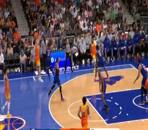 今天他兩次頂著唐斯的封蓋投進,投進各種高難度急停急起的三分,還在快攻轉換中在這個位置投進三分,太夸張了。克拉克森像追庫里那樣追著防他,但只要他擠掩護慢了一拍,康神得到出手機會就投進了。