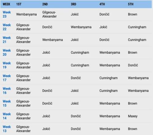 不過雷霆本賽季在常規賽階段多次輸給馬刺,現如今在個人獎項方面,亞歷山大也被文班亞馬反超了。