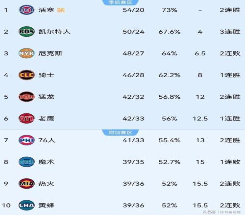 猛龍那,在當今聯盟絕對是數一數二的,就像給對手布了個“天羅地網”。本賽季到現在,場均失分112.0,排在聯盟第九;防守效率112.1,排在第五;限制對手命中率46.5%,排在第十,這數據就像給猛龍的防守實力蓋了個“官方的大印。目前猛龍42勝32負,排在東部第五,就比第七的費城(41-33)多贏了一場,這排名就像在懸崖邊上跳舞,稍有不慎就可能掉下去。魔術39勝35負,排在東部第八,落后第六的老鷹(42-33)2.5個勝場,這差距就像一道難以跨越的鴻溝。